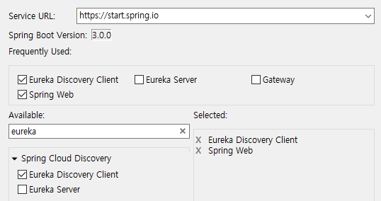 Eureka Discovery Client를 추가하고 Spring Web도 추가한다.