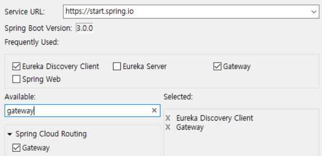 Gateway를 추가하고 Eureka Discovery Client도 추가한다.