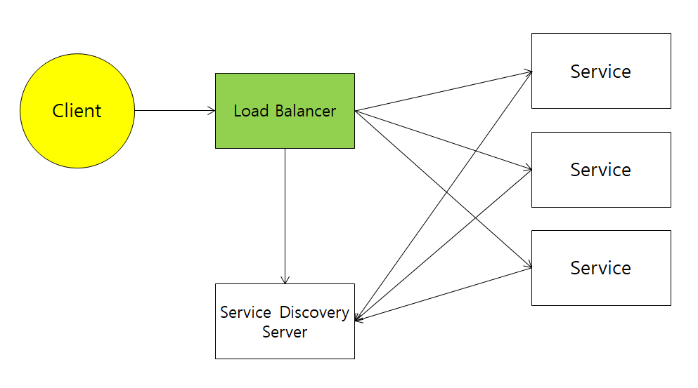 Server Side Discovery는 클라이언트가 로드 밸런서(프록시)를 호출하면 로드 밸런서에서 디스커버리 서버에 서비스의 위치를 확인하여 해당 서비스로 라우팅하는 방식이다.